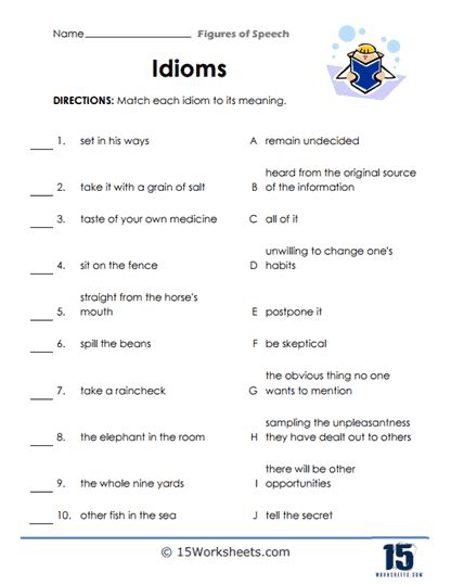 Idioms worksheets are a great way to practice and learn idioms. They usually include a list of idioms and a short explanation of each one. You can use the worksheet to practice matching the idiom to its definition or to practice forming sentences with the idioms.