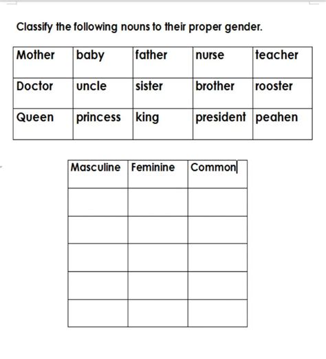 Using a worksheet to help children learn gender nouns can be a great way to help them understand the concept. Not only will it teach them the basics of identifying gender nouns, but it can also help them learn how to use them in sentences. This can help to improve their grammar and sentence structure skills in general.