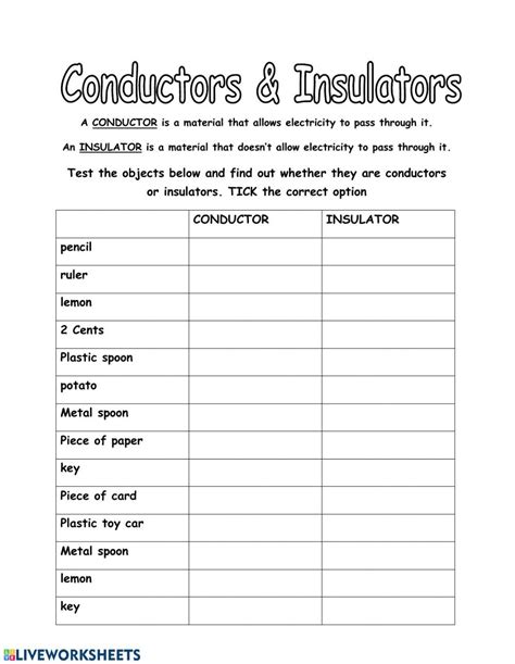 One of the best ways to teach kids about thermal conductors and insulators is to create a printable thermal conductors and insulators worksheet. This worksheet should include a variety of objects, such as common household items and materials found in nature. For each item, the student should indicate whether the item is a conductor or an insulator, and explain why.